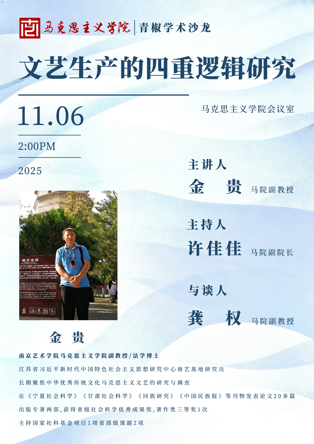 11月6日下午,首期“青椒学术沙龙”在马克思主义学院会议室成功举办。学院特邀学术骨干金贵老师开讲,沙龙的主题是“文艺生产的四重逻辑研究——对习近平总书记以人民为中心的文艺创作思想的学理反思”,龚权老师作为与谈人参与学术交流,院内多位教师参加,副院长许佳佳主持本次活动。